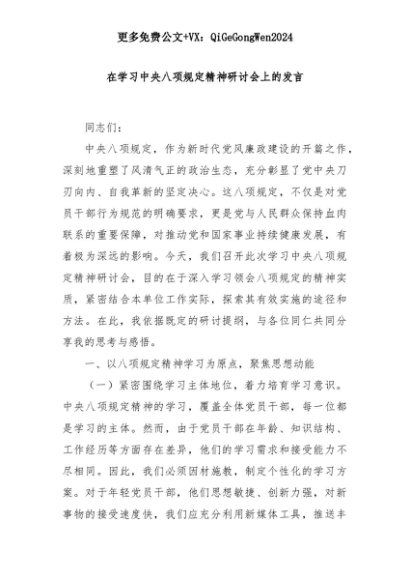 【七哥公文】2025年:在学习中央八项规定精神研讨会上的发言+更多免费公文+VX:QiGeGongWen2024+更多免费公文+VX:QiGeGongWen2024