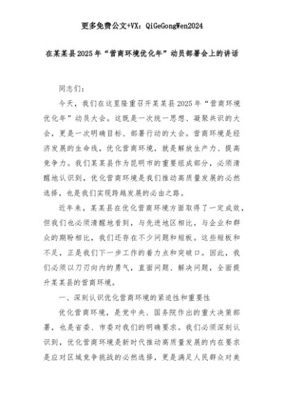 【七哥公文】2025年:在某某县2025年“营商环境优化年”动员部署会上的讲话+更多免费公文+VX:QiGeGongWen2024+更多免费公文+VX:QiGeGongWen2024