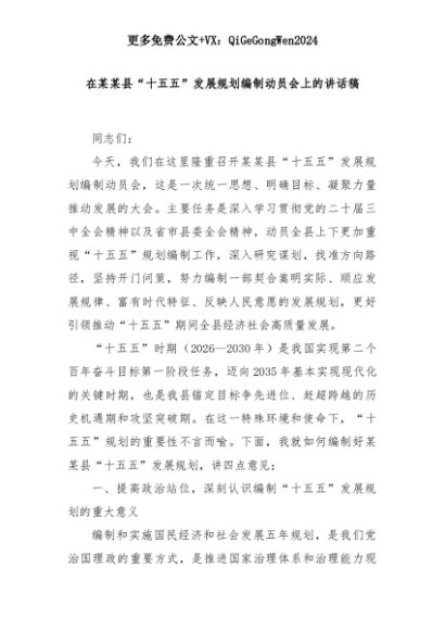 【七哥公文】2025年:在某某县“十五五”发展规划编制动员会上的讲话稿+更多免费公文+VX:QiGeGongWen2024+更多免费公文+VX:QiGeGongWen2024