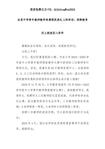 【七哥公文】2025年:在某中学青年教师教学竞赛颁奖典礼上的讲话:深耕教育沃土绽放匠心芳华+更多免费公文+VX:QiGeGongWen2024+更多免费公文+VX:QiGeGongWen2024