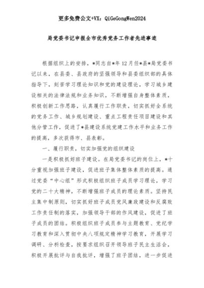 【七哥公文】2025年:局党委书记申报全市优秀党务工作者先进事迹+更多免费公文+VX:QiGeGongWen2024+更多免费公文+VX:QiGeGongWen2024