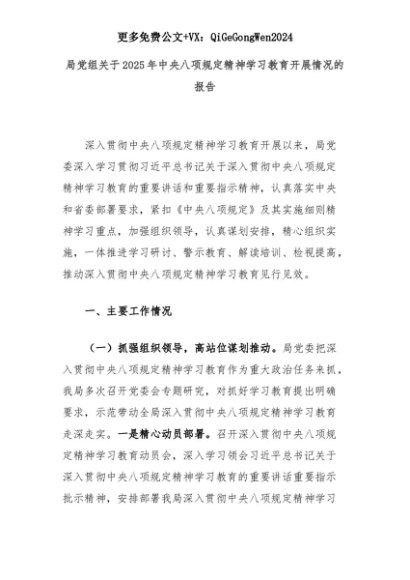 【七哥公文】2025年:局党组关于2025年中央八项规定精神学习教育开展情况的报告+更多免费公文+VX:QiGeGongWen2024+更多免费公文+VX:QiGeGongWen2024