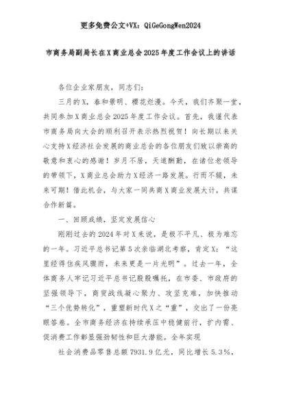【七哥公文】2025年:市商务局副局长在X商业总会2025年度工作会议上的讲话+更多免费公文+VX:QiGeGongWen2024+更多免费公文+VX:QiGeGongWen2024