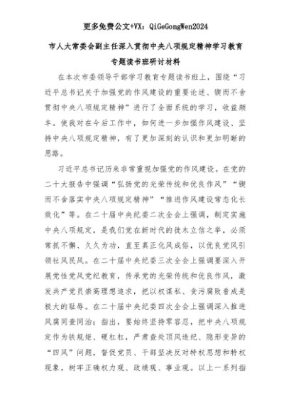 【七哥公文】2025年:市人大常委会副主任深入贯彻中央八项规定精神学习教育专题读书班研讨材料+更多免费公文+VX:QiGeGongWen2024+更多免费公文+VX:QiGeGongWen2024