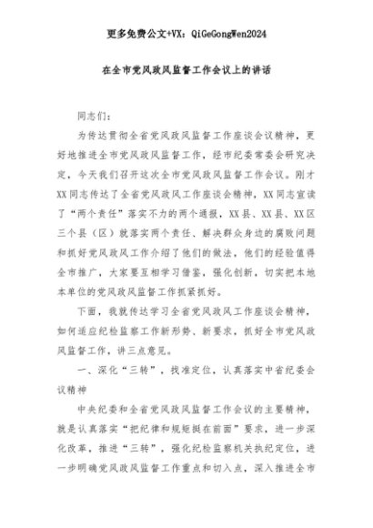 【七哥公文】2025年:在全市党风政风监督工作会议上的讲话+更多免费公文+VX:QiGeGongWen2024+更多免费公文+VX:QiGeGongWen2024