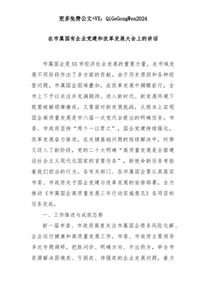 【七哥公文】2025年:在市属国有企业党建和改革发展大会上的讲话+更多免费公文+VX:QiGeGongWen2024+更多免费公文+VX:QiGeGongWen2024