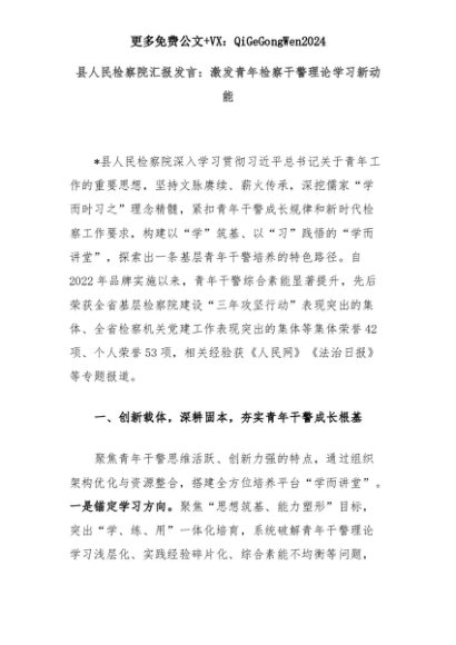 【七哥公文】2025年:县人民检察院汇报发言:激发青年检察干警理论学习新动能+更多免费公文+VX:QiGeGongWen2024+更多免费公文+VX:QiGeGongWen2024