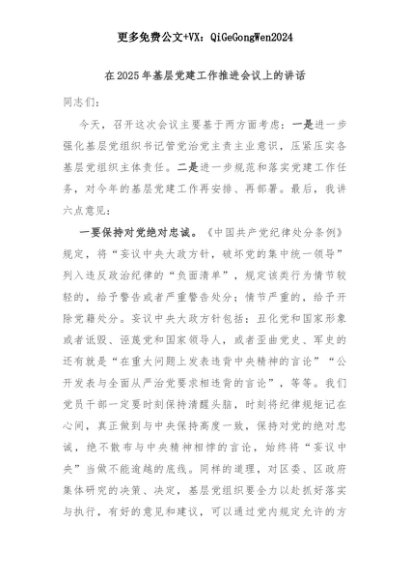 【七哥公文】2025年:在2025年基层党建工作推进会议上的讲话+更多免费公文+VX:QiGeGongWen2024+更多免费公文+VX:QiGeGongWen2024