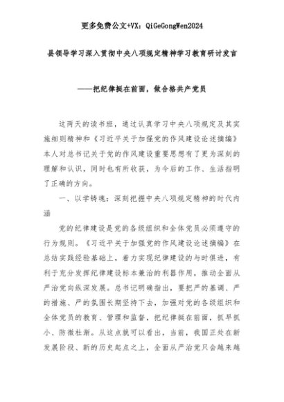 【七哥公文】2025年:县领导学习深入贯彻中央八项规定精神学习教育研讨发言——把纪律挺在前面,做合格共产党员+更多免费公文+VX:QiGeGongWen2024+更多免费公文+VX:QiGeGongWen2024