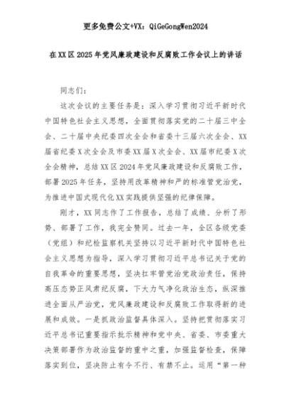 【七哥公文】2025年:在XX区2025年党风廉政建设和反腐败工作会议上的讲话+更多免费公文+VX:QiGeGongWen2024+更多免费公文+VX:QiGeGongWen2024
