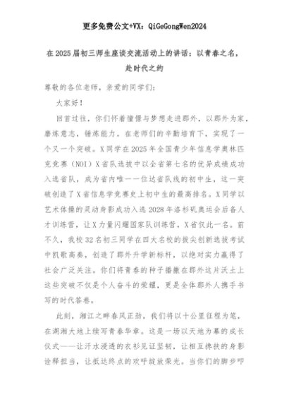【七哥公文】2025年:在2025届初三师生座谈交流活动上的讲话:以青春之名,赴时代之约+更多免费公文+VX:QiGeGongWen2024+更多免费公文+VX:QiGeGongWen2024