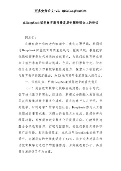 【七哥公文】2025年:在DeepSeek赋能教育高质量发展专题培训会上的讲话+更多免费公文+VX:QiGeGongWen2024+更多免费公文+VX:QiGeGongWen2024