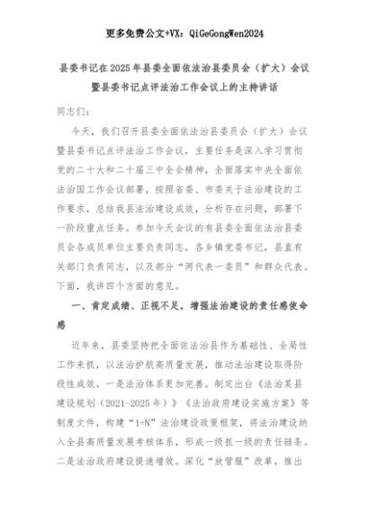 【七哥公文】2025年:县委书记在2025年县委全面依法治县委员会(扩大)会议暨县委书记点评法治工作会议上的主持讲话+更多免费公文+VX:QiGeGongWen2024+更多免费公文+VX:QiGeGongWen2024