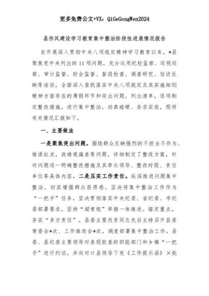 【七哥公文】2025年:县作风建设学习教育集中整治阶段性进展情况报告+更多免费公文+VX:QiGeGongWen2024+更多免费公文+VX:QiGeGongWen2024