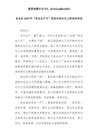 【七哥公文】2025年:在全区2025年“安全生产月”活动启动仪式上的动员讲话+更多免费公文+VX:QiGeGongWen2024+更多免费公文+VX:QiGeGongWen2024
