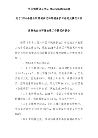【七哥公文】2025年:关于2024年度全区环境状况和环境保护目标完成情况与依法推进生态环境治理工作情况的报告+更多免费公文+VX:QiGeGongWen2024+更多免费公文+VX:QiGeGongWen2024