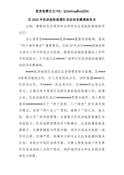 【七哥公文】2025年:区2025年抗洪抢险救援队伍拉动实操演练角本+更多免费公文+VX:QiGeGongWen2024+更多免费公文+VX:QiGeGongWen2024