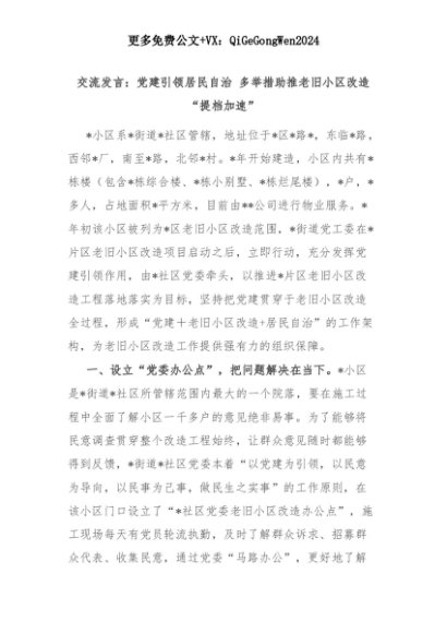 【七哥公文】2025年:交流发言:党建引领居民自治 多举措助推老旧小区改造“提档加速”+更多免费公文+VX:QiGeGongWen2024+更多免费公文+VX:QiGeGongWen2024