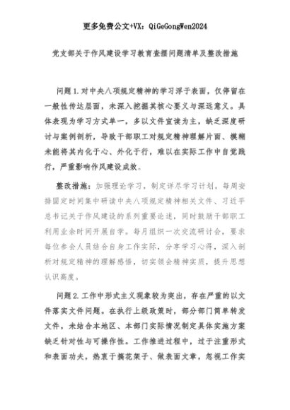 【七哥公文】2025年:党支部关于作风建设学习教育查摆问题清单及整改措施+更多免费公文+VX:QiGeGongWen2024+更多免费公文+VX:QiGeGongWen2024