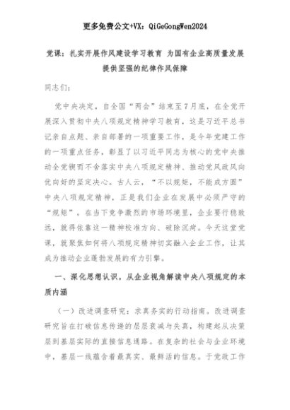 【七哥公文】2025年:党课:扎实开展作风建设学习教育 为国有企业高质量发展提供坚强的纪律作风保障+更多免费公文+VX:QiGeGongWen2024+更多免费公文+VX:QiGeGongWen2024