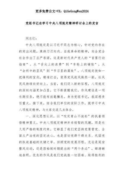 【七哥公文】2025年:党组书记在学习中央八项规定精神研讨会上的发言+更多免费公文+VX:QiGeGongWen2024+更多免费公文+VX:QiGeGongWen2024