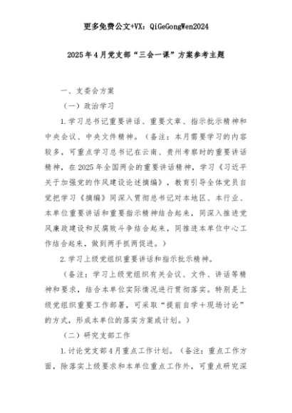 【七哥公文】2025年:2025年4月党支部“三会一课”方案参考主题+更多免费公文+VX:QiGeGongWen2024+更多免费公文+VX:QiGeGongWen2024