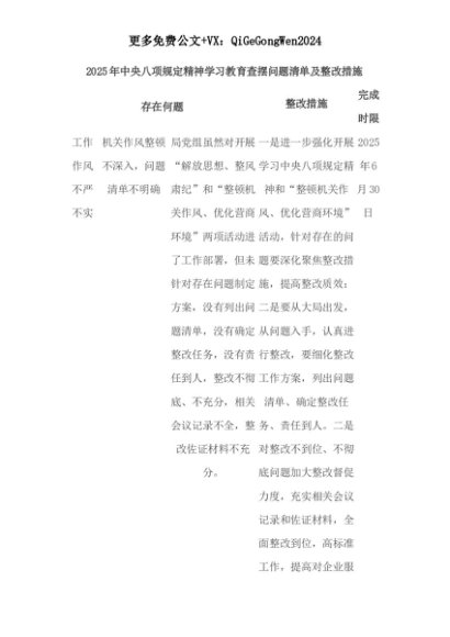 【七哥公文】2025年:2025年中央八项规定精神学习教育查摆问题清单及整改措施+更多免费公文+VX:QiGeGongWen2024+更多免费公文+VX:QiGeGongWen2024