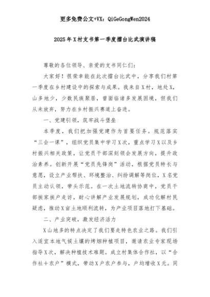【七哥公文】2025年:2025年X村支书第一季度擂台比武演讲稿+更多免费公文+VX:QiGeGongWen2024+更多免费公文+VX:QiGeGongWen2024