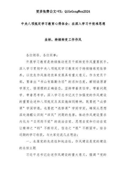 【七哥公文】2025年:中央八项规定学习教育心得体会:在深入学习中校准思想坐标,持续转变工作作风+更多免费公文+VX:QiGeGongWen2024+更多免费公文+VX:QiGeGongWen2024