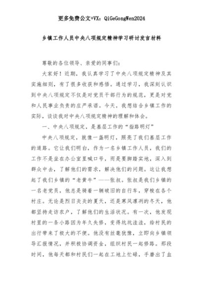 【七哥公文】2025年:乡镇工作人员中央八项规定精神学习研讨发言材料+更多免费公文+VX:QiGeGongWen2024+更多免费公文+VX:QiGeGongWen2024