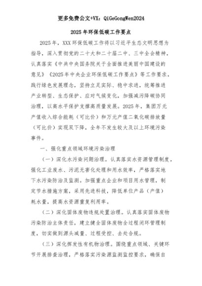 【七哥公文】2025年:2025年环保低碳工作要点+更多免费公文+VX:QiGeGongWen2024+更多免费公文+VX:QiGeGongWen2024