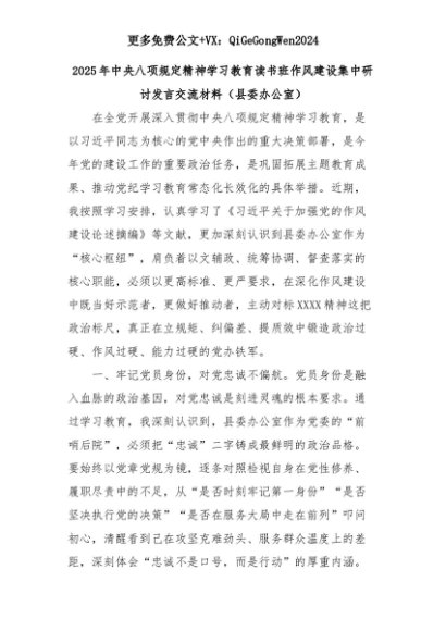 【七哥公文】2025年:2025年中央八项规定精神学习教育读书班作风建设集中研讨发言交流材料(县委办公室)+更多免费公文+VX:QiGeGongWen2024+更多免费公文+VX:QiGeGongWen2024