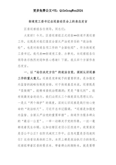 【七哥公文】2025年:街道党工委书记在巡查动员会上的表态发言+更多免费公文+VX:QiGeGongWen2024+更多免费公文+VX:QiGeGongWen2024