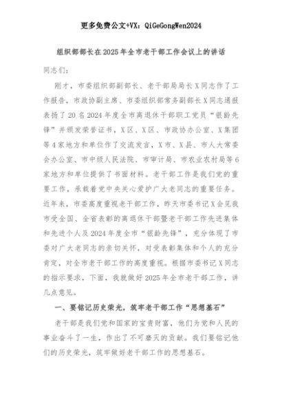 【七哥公文】2025年:组织部部长在2025年全市老干部工作会议上的讲话+更多免费公文+VX:QiGeGongWen2024+更多免费公文+VX:QiGeGongWen2024