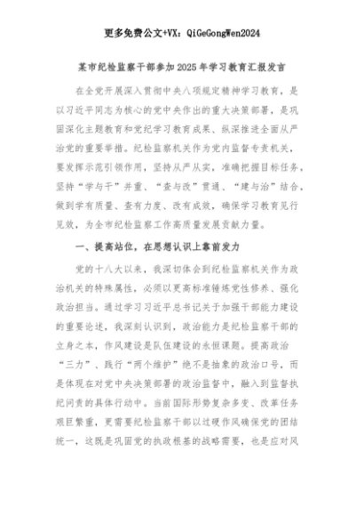 【七哥公文】2025年:某市纪检监察干部参加2025年学习教育汇报发言+更多免费公文+VX:QiGeGongWen2024+更多免费公文+VX:QiGeGongWen2024