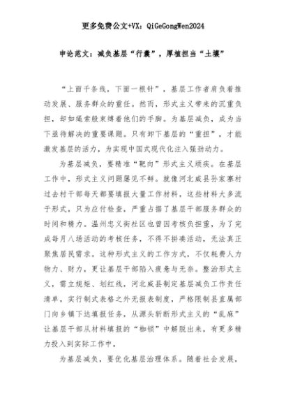 【七哥公文】2025年:申论范文:减负基层“行囊”,厚植担当“土壤”+更多免费公文+VX:QiGeGongWen2024+更多免费公文+VX:QiGeGongWen2024