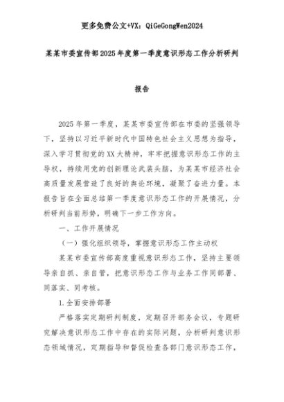 【七哥公文】2025年:某某市委宣传部2025年度第一季度意识形态工作分析研判报告+更多免费公文+VX:QiGeGongWen2024+更多免费公文+VX:QiGeGongWen2024
