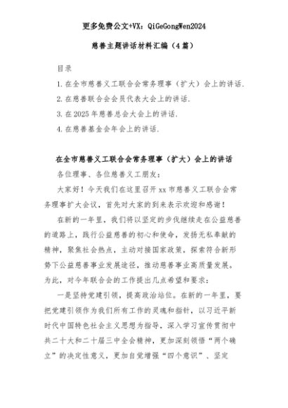 【七哥公文】2025年:(4篇)慈善主题讲话材料汇编+更多免费公文+VX:QiGeGongWen2024+更多免费公文+VX:QiGeGongWen2024