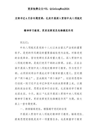 【七哥公文】2025年:支部书记4月份专题党课:扎实开展深入贯彻中央八项规定精神学习教育,更好发挥党员先锋模范作用+更多免费公文+VX:QiGeGongWen2024+更多免费公文+VX:QiGeGongWen2024