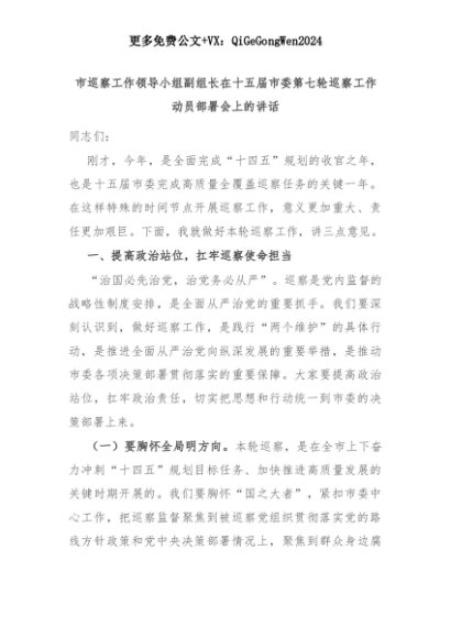 【七哥公文】2025年:市巡察工作领导小组副组长在十五届市委第七轮巡察工作动员部署会上的讲话+更多免费公文+VX:QiGeGongWen2024+更多免费公文+VX:QiGeGongWen2024