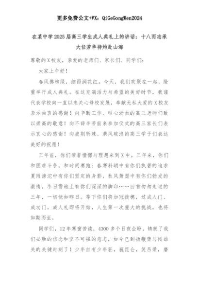 【七哥公文】2025年:在某中学2025届高三学生成人典礼上的讲话:十八而志承大任芳华待灼赴山海+更多免费公文+VX:QiGeGongWen2024+更多免费公文+VX:QiGeGongWen2024