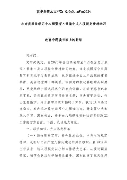 【七哥公文】2025年:在市委理论学习中心组暨深入贯彻中央八项规定精神学习教育专题读书班上的讲话+更多免费公文+VX:QiGeGongWen2024+更多免费公文+VX:QiGeGongWen2024