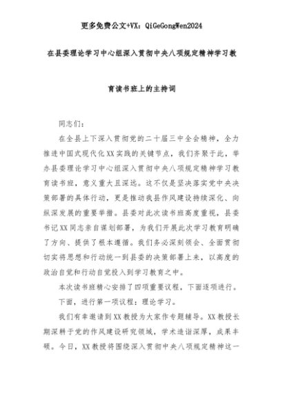 【七哥公文】2025年:在县委理论学习中心组深入贯彻中央八项规定精神学习教育读书班上的主持词+更多免费公文+VX:QiGeGongWen2024+更多免费公文+VX:QiGeGongWen2024