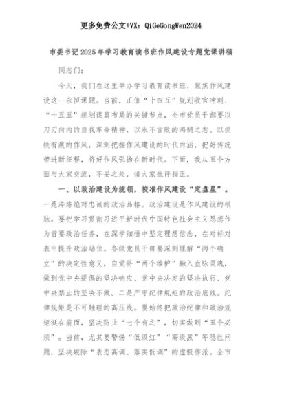 【七哥公文】2025年:市委书记2025年学习教育读书班作风建设专题党课讲稿+更多免费公文+VX:QiGeGongWen2024+更多免费公文+VX:QiGeGongWen2024