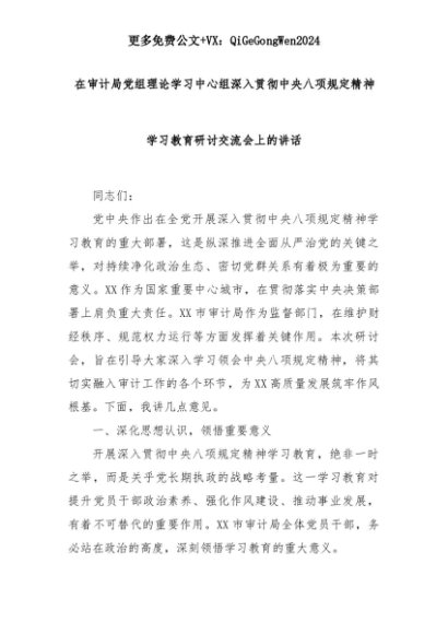 【七哥公文】2025年:在审计局党组理论学习中心组深入贯彻中央八项规定精神学习教育研讨交流会上的讲话+更多免费公文+VX:QiGeGongWen2024+更多免费公文+VX:QiGeGongWen2024