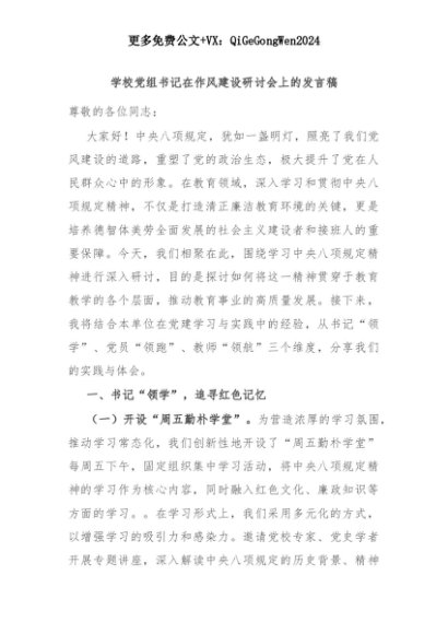 【七哥公文】2025年:学校党组书记在作风建设研讨会上的发言稿+更多免费公文+VX:QiGeGongWen2024+更多免费公文+VX:QiGeGongWen2024