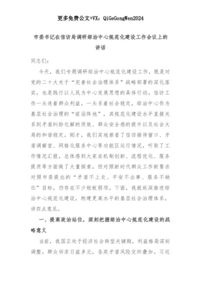 【七哥公文】2025年:市委书记在信访局调研综治中心规范化建设工作会议上的讲话+更多免费公文+VX:QiGeGongWen2024+更多免费公文+VX:QiGeGongWen2024