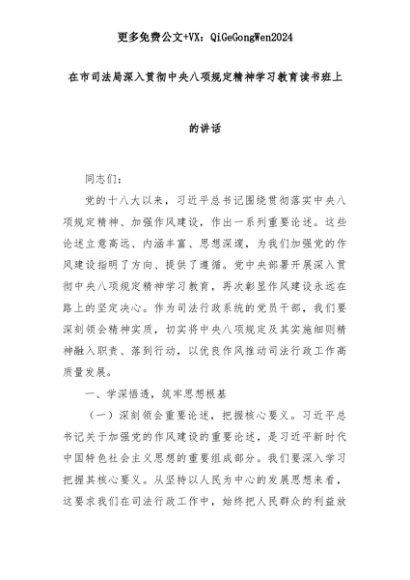 【七哥公文】2025年:在市司法局深入贯彻中央八项规定精神学习教育读书班上的讲话+更多免费公文+VX:QiGeGongWen2024+更多免费公文+VX:QiGeGongWen2024