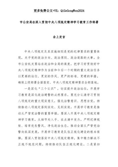 【七哥公文】2025年:市公安局在深入贯彻中央八项规定精神学习教育工作部署会上发言+更多免费公文+VX:QiGeGongWen2024+更多免费公文+VX:QiGeGongWen2024