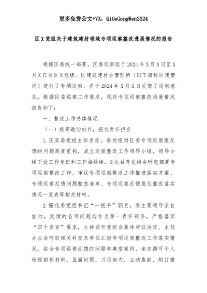 【七哥公文】2025年:区X党组关于建筑建材领域专项巡察整改进展情况的报告+更多免费公文+VX:QiGeGongWen2024+更多免费公文+VX:QiGeGongWen2024